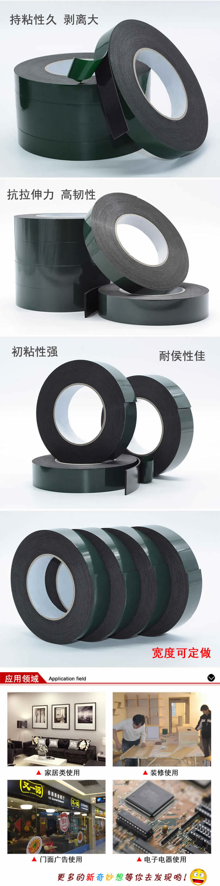 PE泡棉双面胶是指在PE发泡的基材上两面涂上压克力胶水而成的双面胶。颜色主要有白色、黑色及灰色,常用厚度有0.3mm、0.5mm、0.8mm、1.0mm、1.5mm、2.0mm及3.0mm,泡棉发泡倍数有5倍、8倍、10倍、15倍、20倍及30倍,离型主要为离型纸(白色、黄色)及离型膜(红色、绿色、蓝色、橙色),用途:适用于相框装饰条、家具饰条、汽车饰条、浪板、轮弧、挡流、板刹车灯、汽车车标、摩托车标牌、电器铭牌、毛条等方面的粘贴固定作用,特点:粘着力强、保持力佳、防紫外线、耐温性、耐水性、耐溶性及可抗塑性。适用温度:-20℃~120℃。