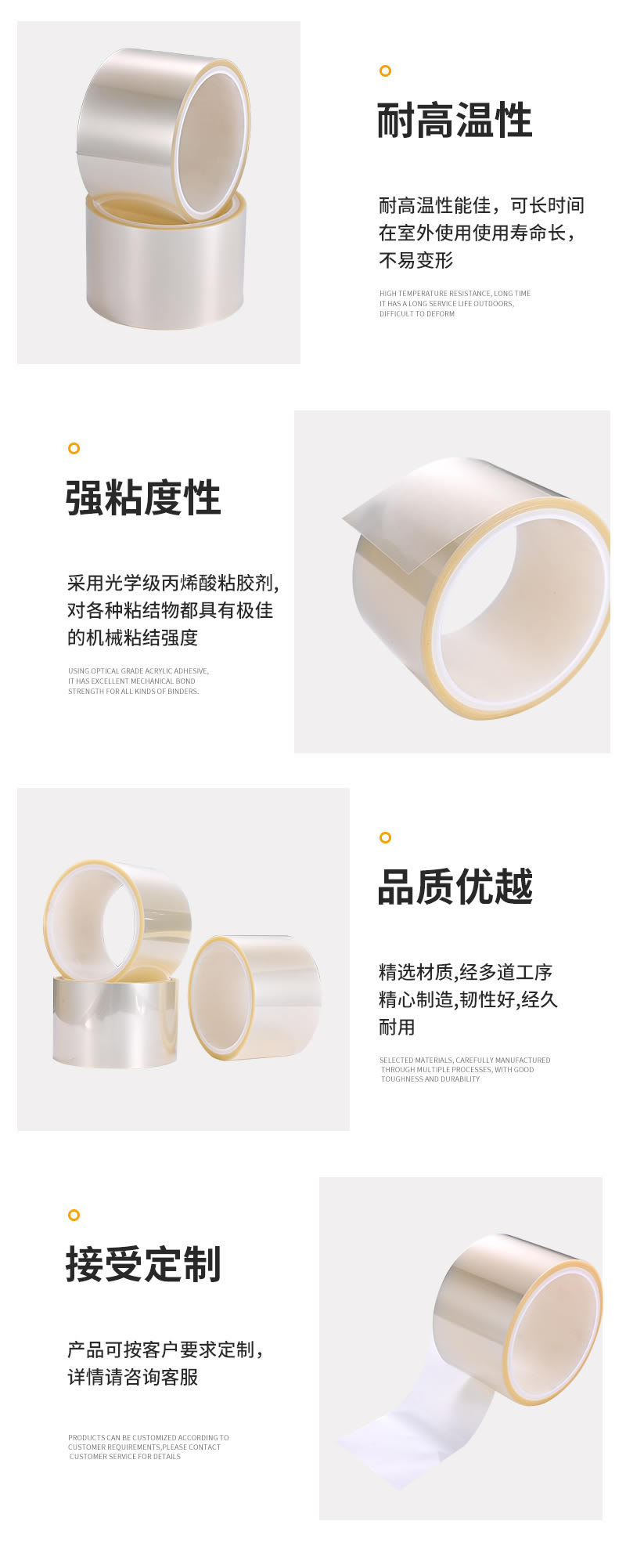 产品型号 颜色 胶带厚度 (mm) 粘着力 A面 (g/25mm) 粘着力B面 (g/25mm) QD56-TM-0003 透明 0.003 300 300 QD56-TM-0005 透明 0.005 500 500 QD56-TM-001 透明 0.01 1000 1000 QD56-TM-001 透明 0.01 900 900 QD56-TM-002 透明 0.02 1400 1400 QD56-TM-003 透明 0.03 1200 1200 QD56-TM-005 透明 0.05 1500 1500