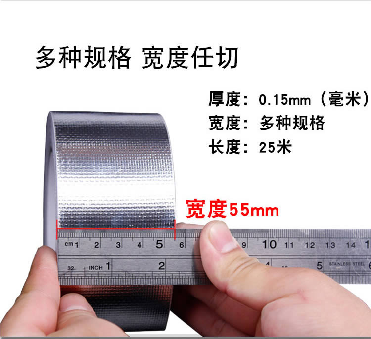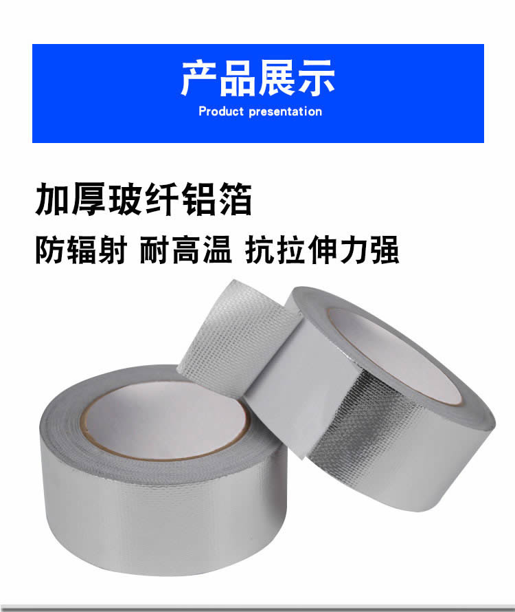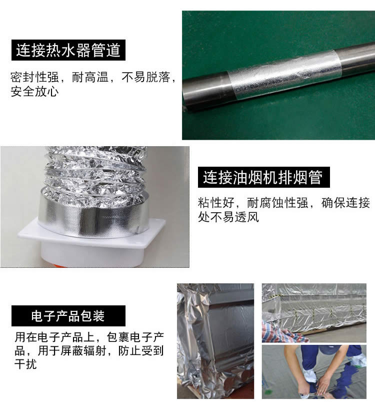 用于适用:铝箔风管专用胶带、铁皮风管外保温、玻璃棉贴面接缝胶带、管道连接处密封、燃气烟管、油烟机烟管均可,具有耐高温性能,防火,高温管道反射 缘包扎,特种电缆包扎以防热军工行业使用。