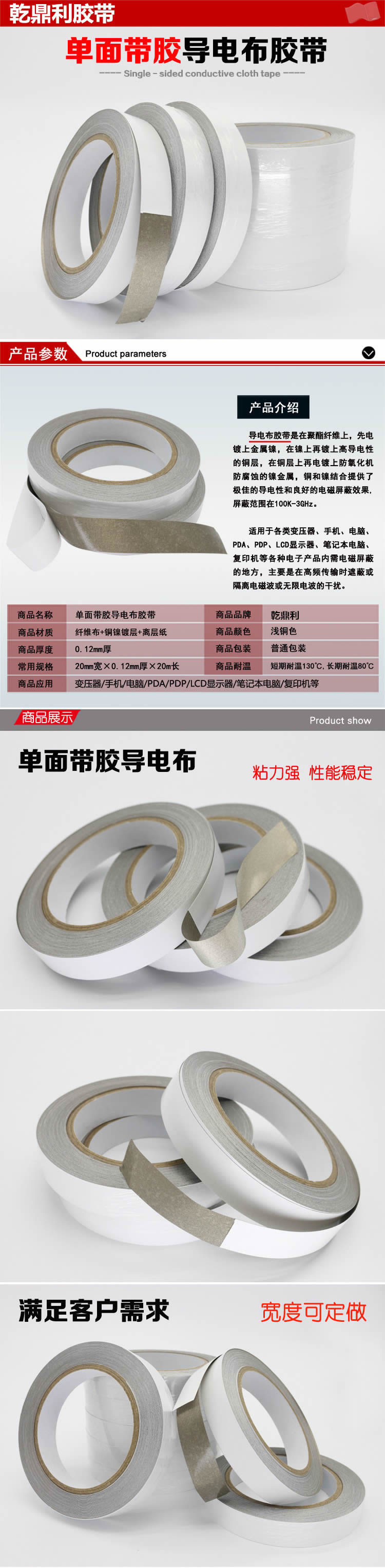 - 单面导电胶布 银色平纹双面导电布胶带 银胶屏蔽胶带导电布的制作工程是以纤维布(一般常用聚醋纤维布)经过前置处理后施以电镀金属镀层使其具有金属特性而成为导电纤维布。导电布厚度:0.03MM 0.05MM 0.08MM 0.12MM 0.18MM 0.22MM(可定做)导电布性能参数●表面阻抗值:0.05ohm/□mo Test machine(0.5kgf)●摩擦阻抗值:>...