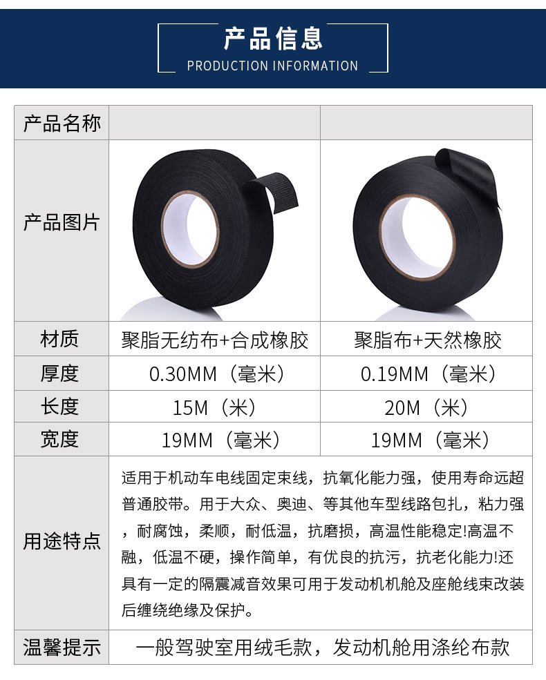 应 用:用于高档汽车线束中的捆扎,尤其使用于有降噪声和防磨要求的场合,能够减少振动是线束于汽车内部部件碰撞时产生的噪声。