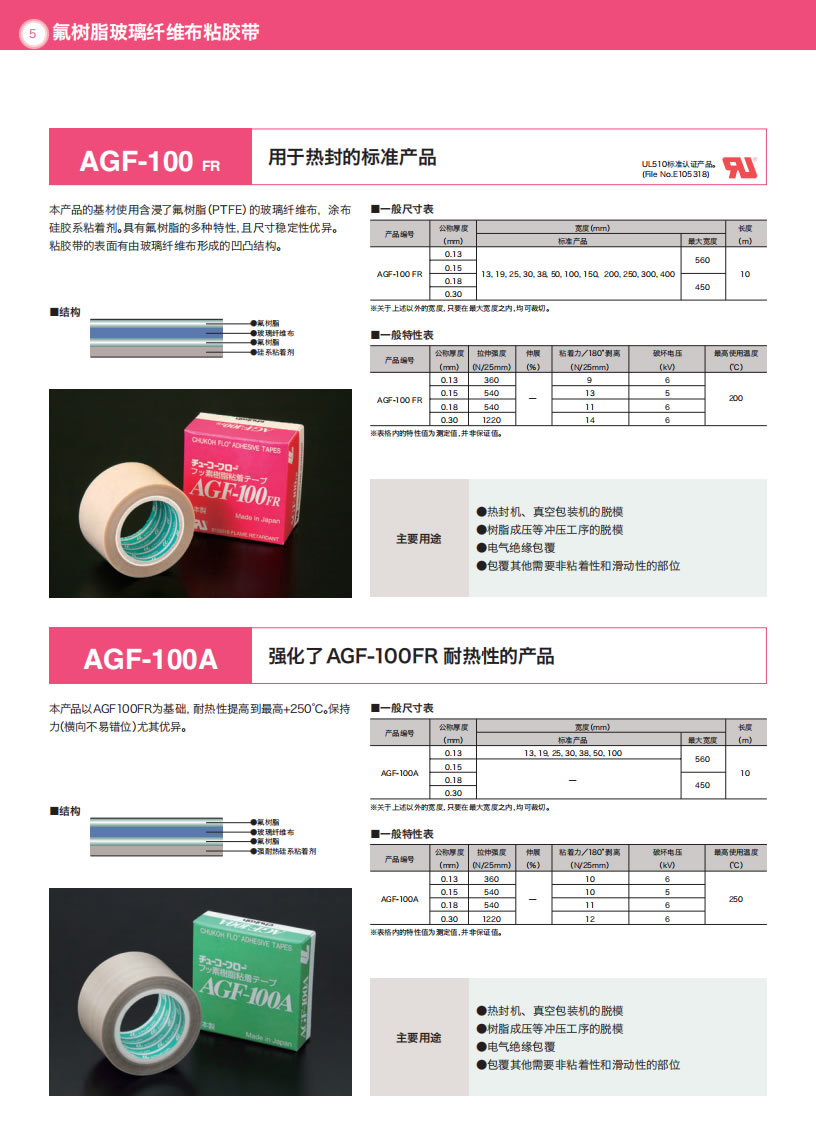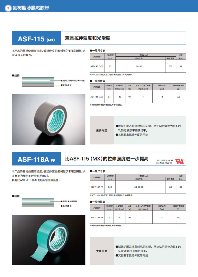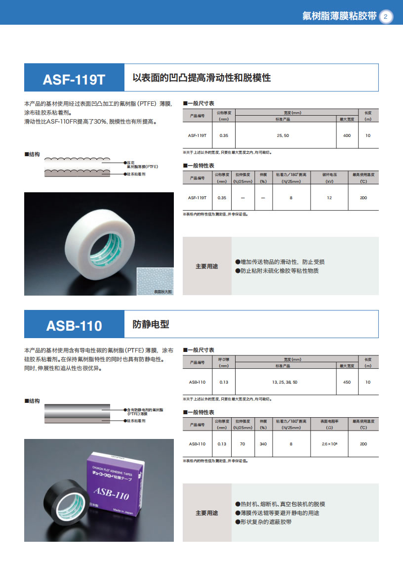 - 产品详情用途・热封条机压接部的覆盖物・料斗·滑槽的摩擦面衬里・绝缘胶带・绝缘用隔离物・接线部位的绝缘覆盖物等等使用温度范围-60°C〜+200°C结构特长●具备柔软性、伸缩性,以及对对象物形状的追随性。●胶带表面具有优秀的非粘着性、分离性、滑动性、耐化学药品性、防水性。●具有优秀的电流绝缘性、耐候...