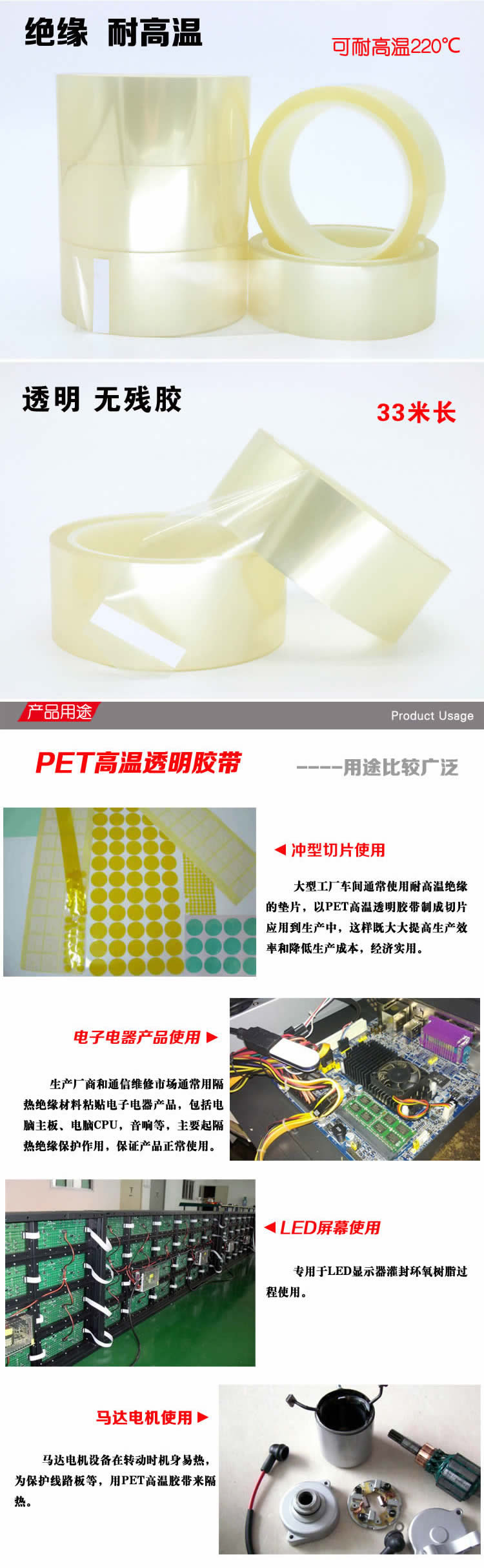 - 透明高温胶带耐高温LED灯胶带透明胶带线路板PCB板电镀胶电子保护喷涂遮蔽PET耐高温胶带无痕单面胶纸PET透明高温胶带产品信息1产品名称:PET高温胶带2产品厚度:0.05-0.1mm(特殊可定做)3产品颜色:绿色黄色蓝色橙色灰色(特殊颜色可定做)4产品基材:PET5产品背材:硅胶6产品规格:可以按照客户要求分切任意规格(宽1400mm以...