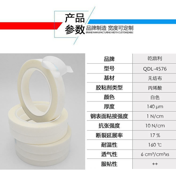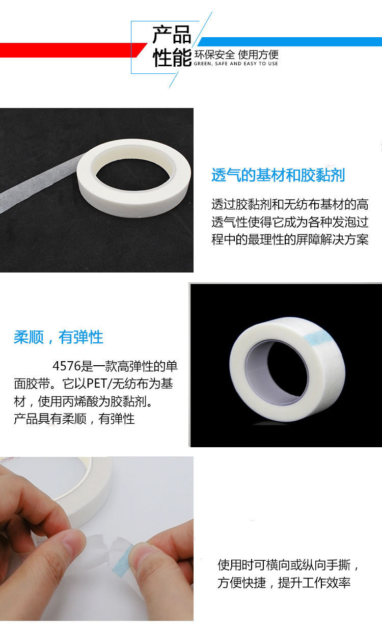 透气胶带是一款高弹性的单面胶带。它以PET/无纺布为基材,使用丙烯酸为胶黏剂。