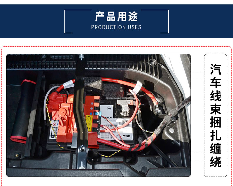 应 用:用于高档汽车线束中的捆扎,尤其使用于有降噪声和防磨要求的场合,能够减少振动是线束于汽车内部部件碰撞时产生的噪声。