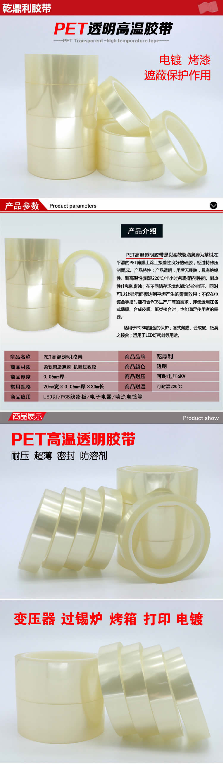 - 透明高温胶带耐高温LED灯胶带透明胶带线路板PCB板电镀胶电子保护喷涂遮蔽PET耐高温胶带无痕单面胶纸PET透明高温胶带产品信息1产品名称:PET高温胶带2产品厚度:0.05-0.1mm(特殊可定做)3产品颜色:绿色黄色蓝色橙色灰色(特殊颜色可定做)4产品基材:PET5产品背材:硅胶6产品规格:可以按照客户要求分切任意规格(宽1400mm以...