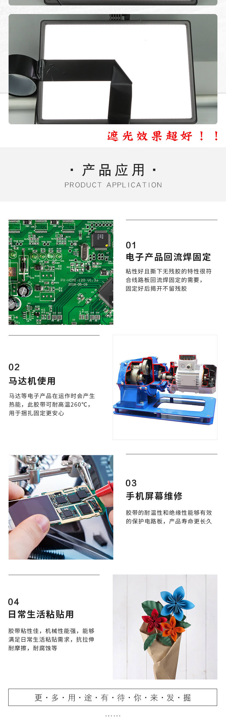 用途:用于喷漆、喷粉、涂装、高温烤漆、镀金或电镀过程中遮蔽需保护部分,也可用于电子、电气等产品绝缘包扎固定。